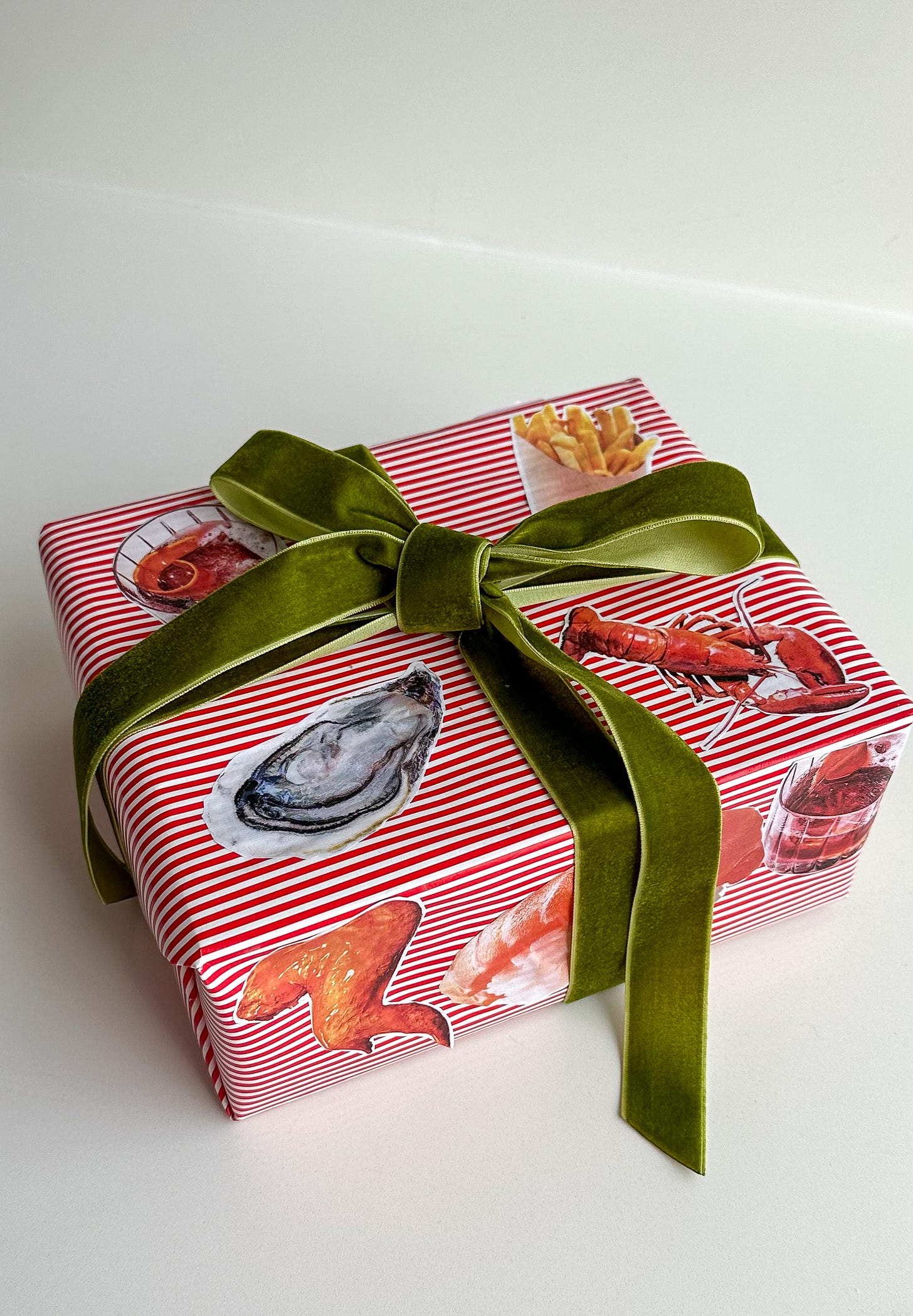 An inexpensive way to enhance any gift is to personalize it! Here I printed out photos of all of my boyfriend’s favorite things (Negronis, french fries, oysters, wings, sushi, lobster) and pasted them to some Amazon wrapping paper. Plus a velvet ribbon to tie it all together (literally).